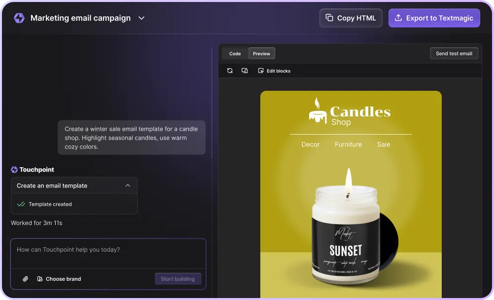 Touchpoint is your AI-powered partner for creating branded, stylish emails that engage. From product launches to newsletters, email template creation is easy — no design or coding skills required. Just bring the message, and we’ll do the rest.